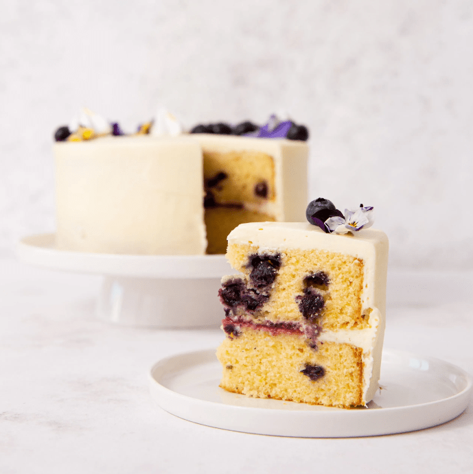 Cette génoise au fromage blanc et à la vanille avec des myrtilles à l’intérieur est subtile et délicate 🫐.