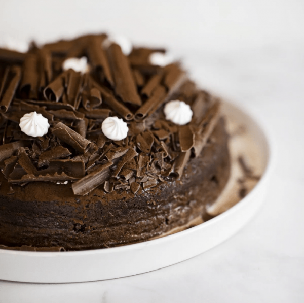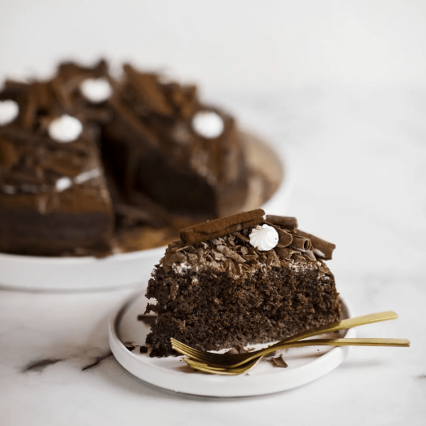 Une génoise moelleuse trempée dans un mélange de laits, garnie de copeaux de chocolat noir et de poudre de cacao.